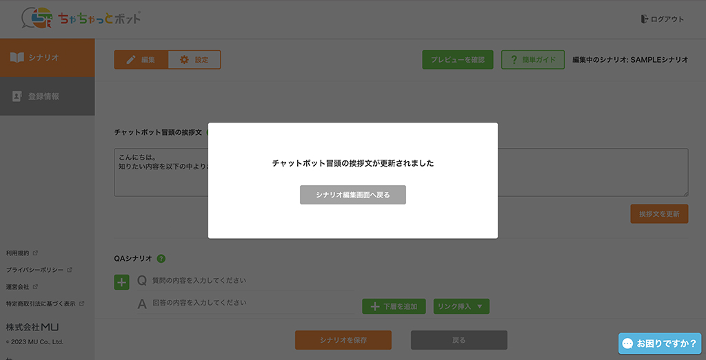 ③「チャットボット冒頭の挨拶文が更新されました」と表示されたら完了となります。